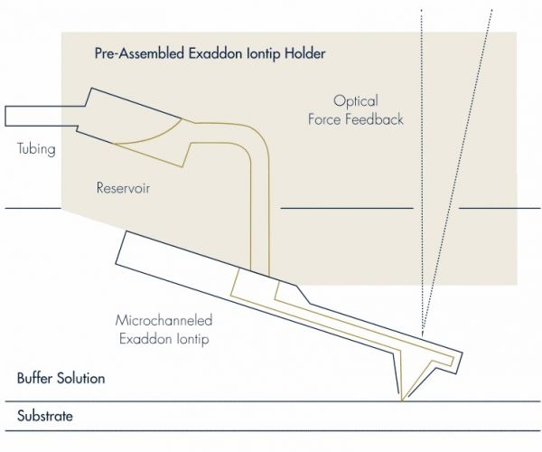 CERES的增材微制造(μAM)技术基于电化学沉积。将一个名为iontip的小打印喷嘴浸入电解液中,准确调节的气压将包含金属离子的液体推进离子头内部的微通道,液体流量非常小低至每秒飞升。在微通道的末端,含离子的液体被释放到打印表面上。然后将溶解的金属离子电沉积为固体金属原子。
